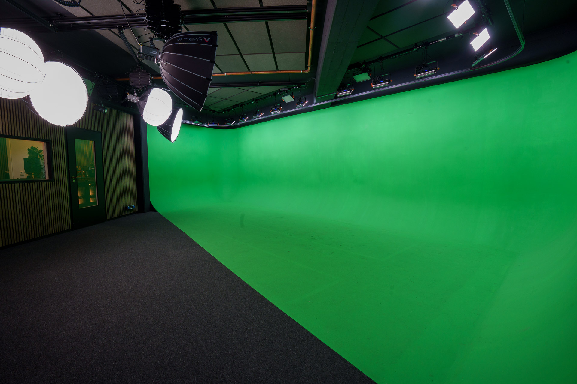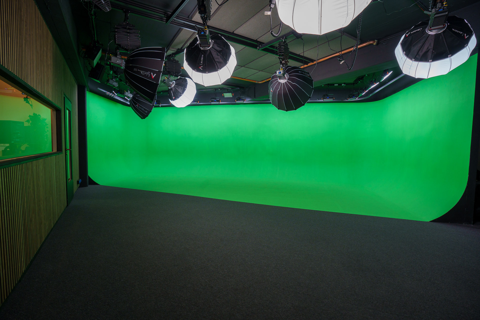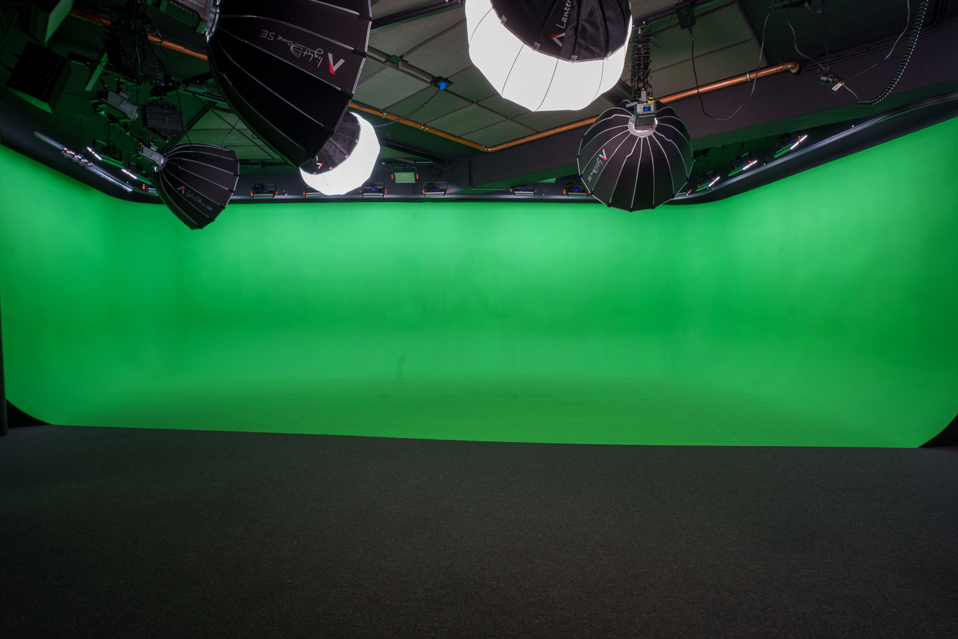 Präsentiere dich im Studiosetting vor virtuellen Hintergründen oder individuell gebauten Kulissen.